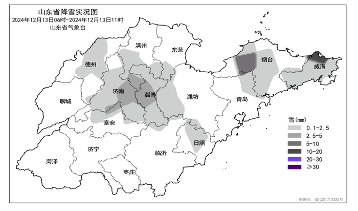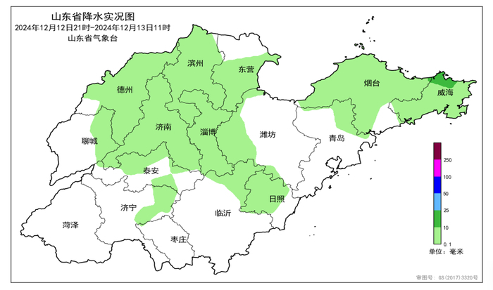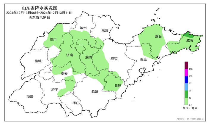 据山东省气象台消息,12月13日6时至13日11时这5个小时里,全省共有13市、45县(区市)出现降水,平均降水量0.7(毫米,下同),折合水量约1.1亿立方米。各市平均:威海3.6、淄博2.5、烟台1.3、济南1.2、滨州0.7、东营0.5、泰安0.5、潍坊0.3、德州0.3和日照0.2,其他市微量或无降水。县(区市)平均降水量超过10.0的1个,5.0—10.0的1个,1.0—5.0的23个,前3位的是:威海市区13.3、烟台招远7.2和济南章丘4.0。
