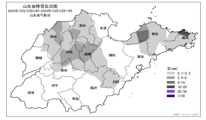 从过程降雪量来看,12月12日21时至13日11时,全省共有13市、52县(区市)出现降雪,平均降雪量0.8(毫米,下同)。各市平均:淄博2.9、威海2.7、济南2.0、烟台1.5、滨州1.3、德州1.2、泰安0.8、东营0.6、潍坊0.3、日照0.2和青岛0.1,其他市微量或无降雪。县(区市)平均降雪量超过10.0的1个,5.0—10.0的1个,2.5.0—5.0的15个,前3位的是:威海市区12.3、烟台招远7.0和泰安泰山4.1。最大积雪深度排前3位的是,烟台招远6厘米、德州宁津6厘米和滨州惠民4厘米。