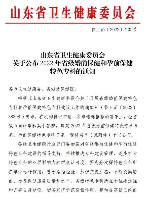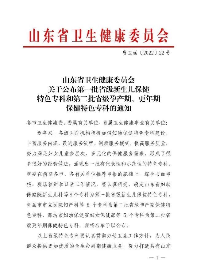 我院拥有2项国家级建设单位、2项省级单位、1个省级重点学科、4项省级特色专科、2项市级特色专科、12项市级重点专科、3项市级重点学科及2项市级重点实验室,挂牌2个泰山学者工作站,5个博士工作室。先后荣获全国三八红旗集体、国家巾帼文明岗、全国妇幼健康服务先进集体、全国五四红旗团委、省级文明单位等荣誉百余项。