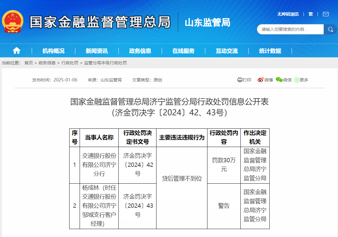 国家金融监督管理总局山东监管局发布行政处罚决定,交通银行股份有限公司济宁分行因贷后管理不到位违法违规行为被行政处罚,罚款30万元。