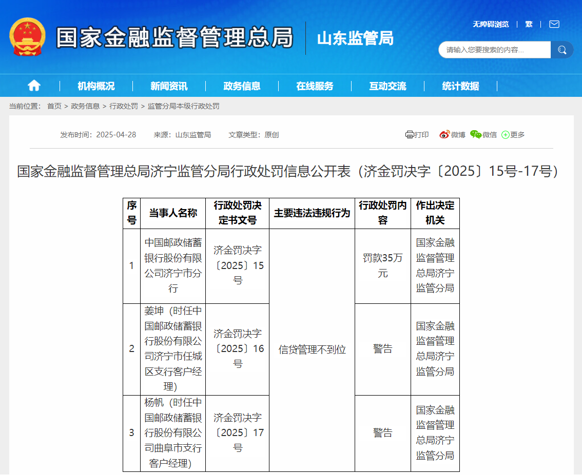 根据公示信息,中国邮政储蓄银行股份有限公司济宁市分行因“信贷管理不到位”被处以罚款35万元(济金罚决字〔2025〕15号),时任该行任城区支行客户经理姜坤、曲阜市支行客户经理杨帆因同类问题被予以警告处分(济金罚决字〔2025〕16号、17号)。