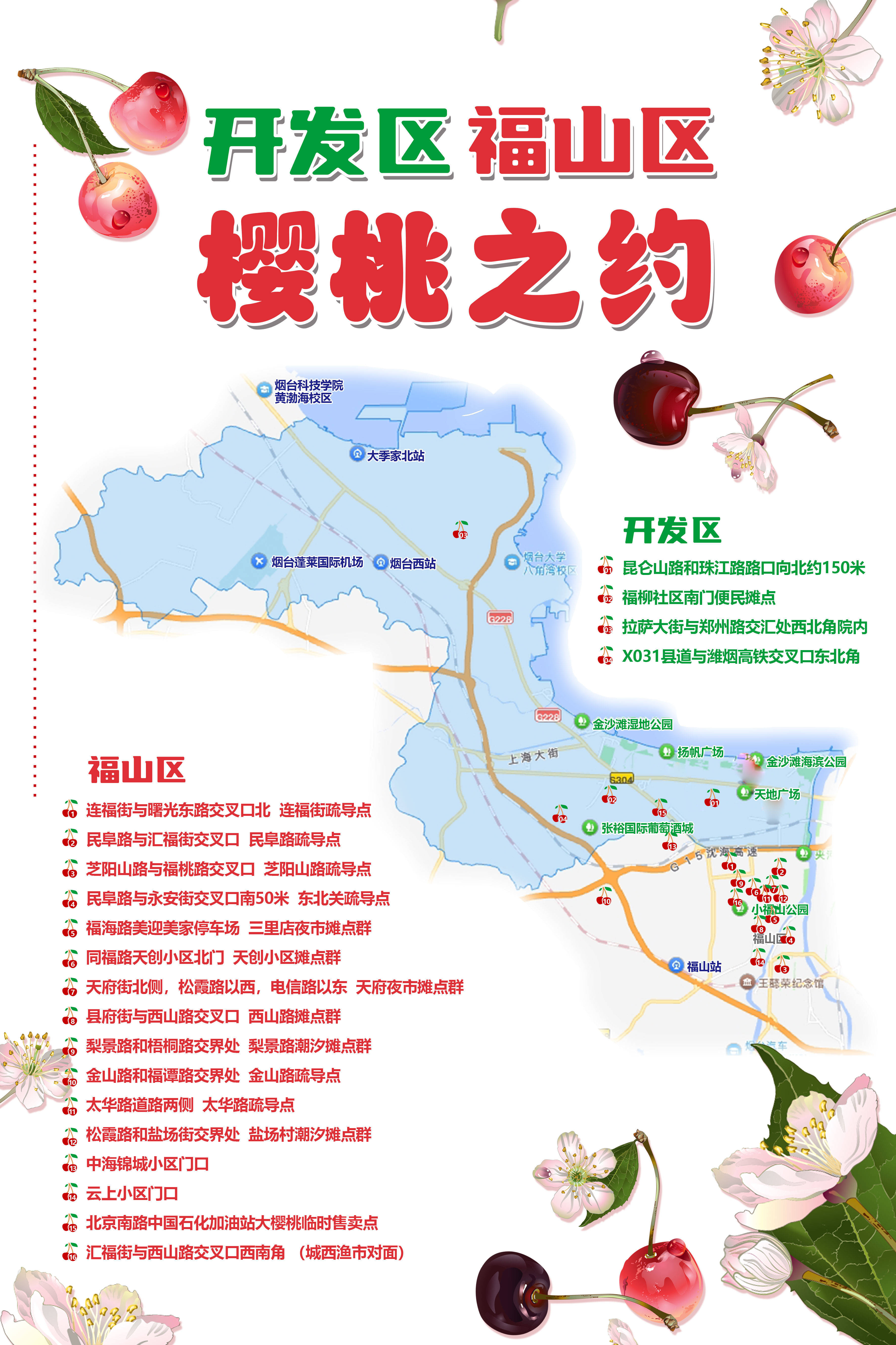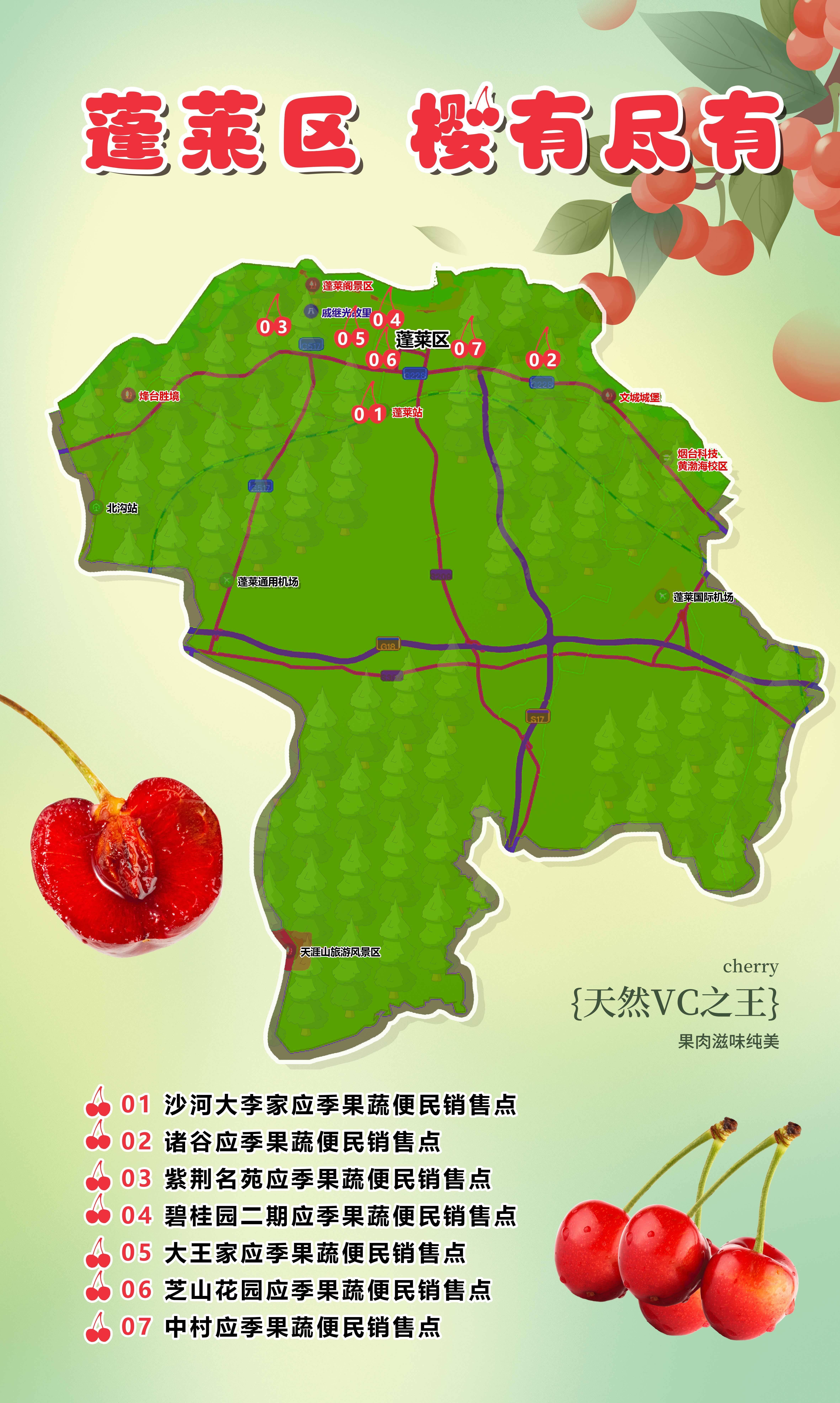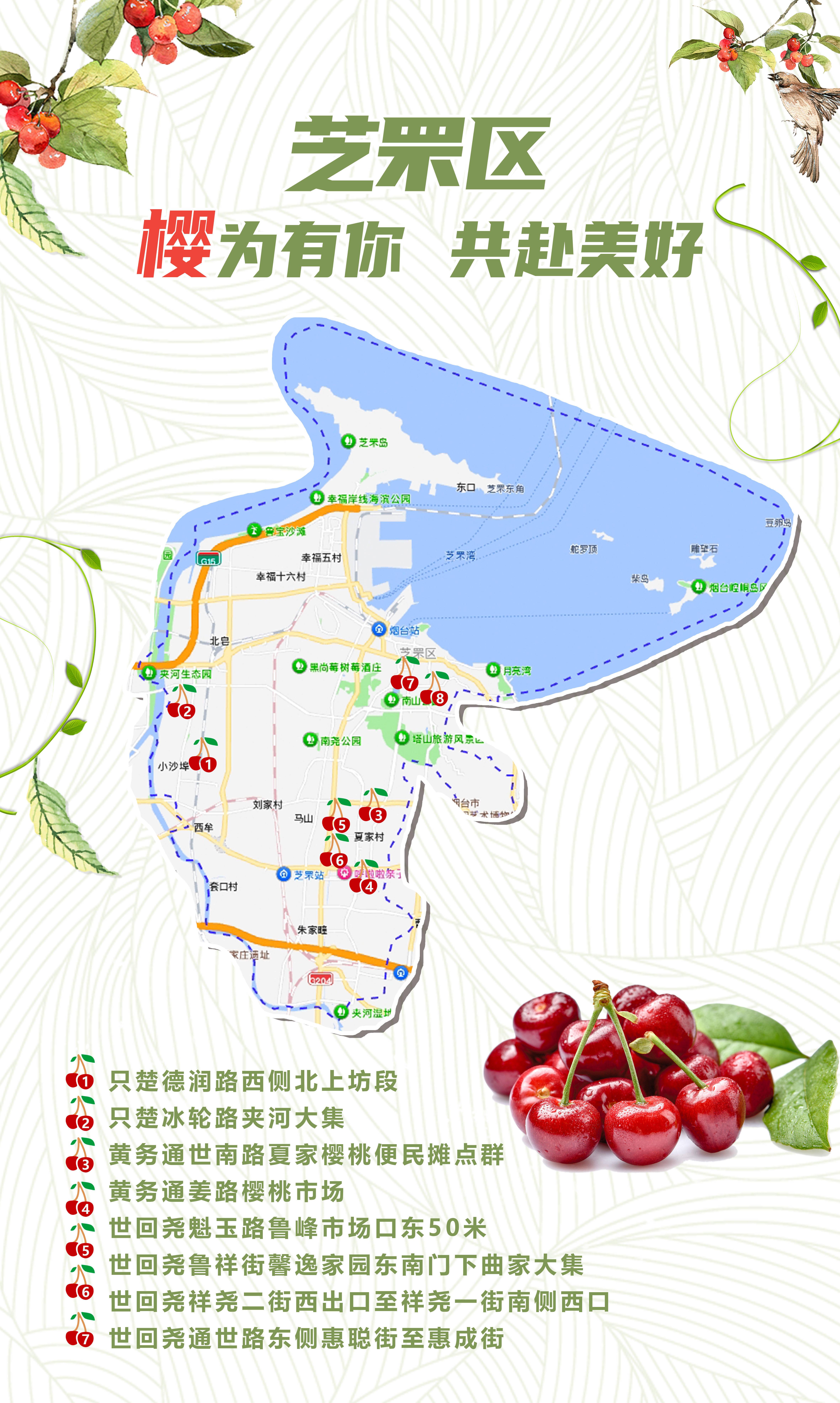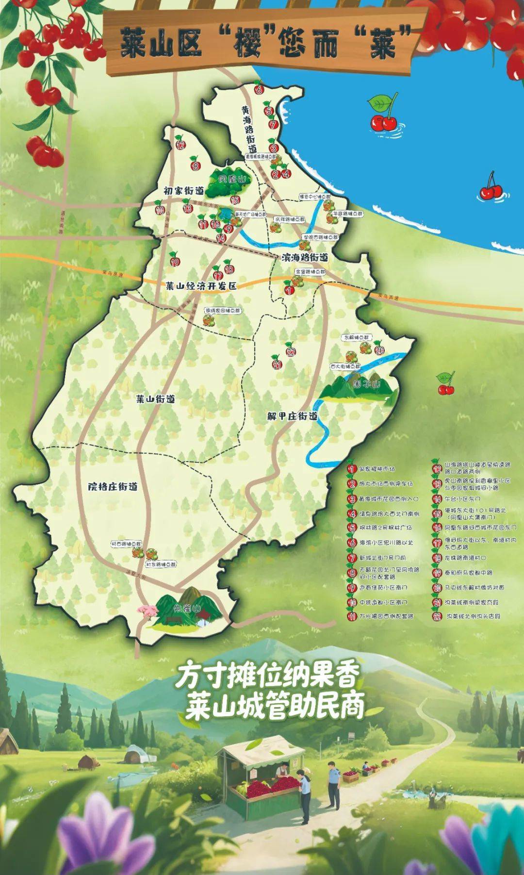 市民可通过导航软件搜索,实现便民摊点“一网统览”,导航“一键直达”,同时依托便民摊点群增设樱桃季临时售卖点57处,实现家门口的“樱桃自由”。