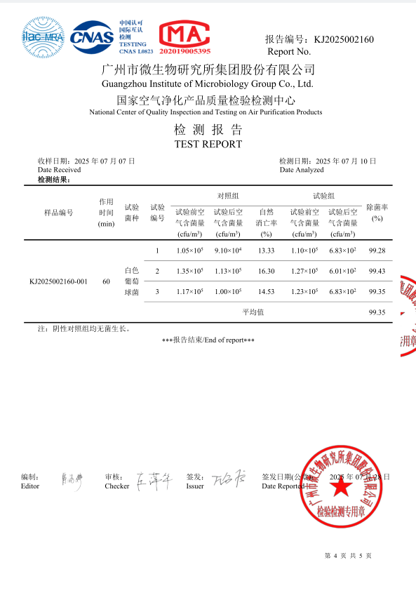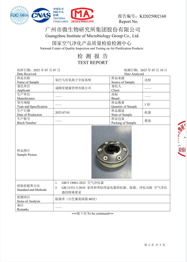 广州市微生物研究所集团股份有限公司国家空气净化产品质量检验检测中心出据的检测报告显示,氧巴马——负氧离子全屋系统的除菌率(以标准菌株白色葡萄球菌为指示菌株)为99.35%。