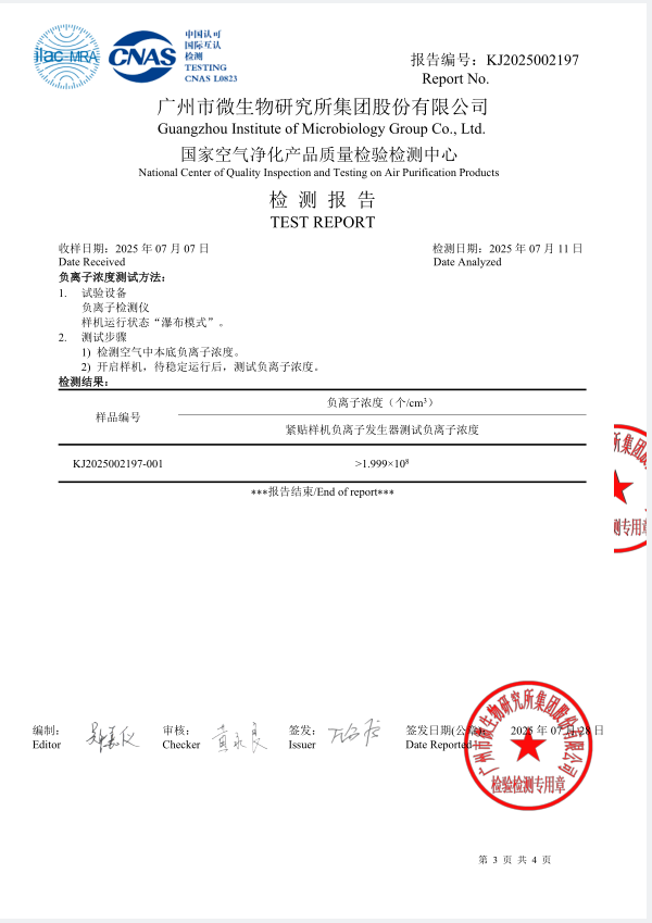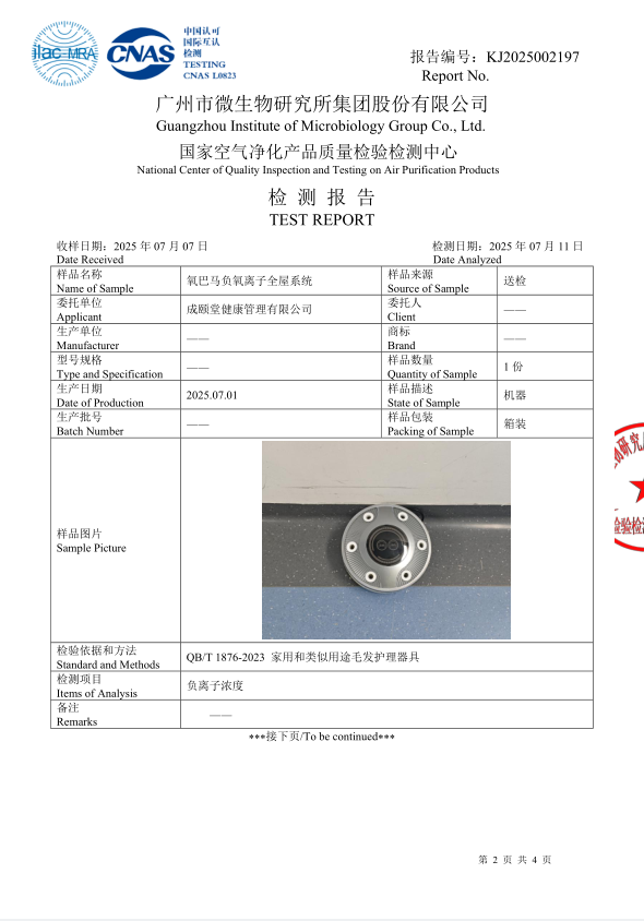 据广州市微生物研究所集团股份有限公司国家空气净化产品质量检验检测中心出据的检测报告显示,氧巴马——负氧离子全屋系统氧巴马——负氧离子全屋系统的负氧离子放射口处测量,所产生的负氧离子最高浓度达到每立方厘米1.999亿个以上。