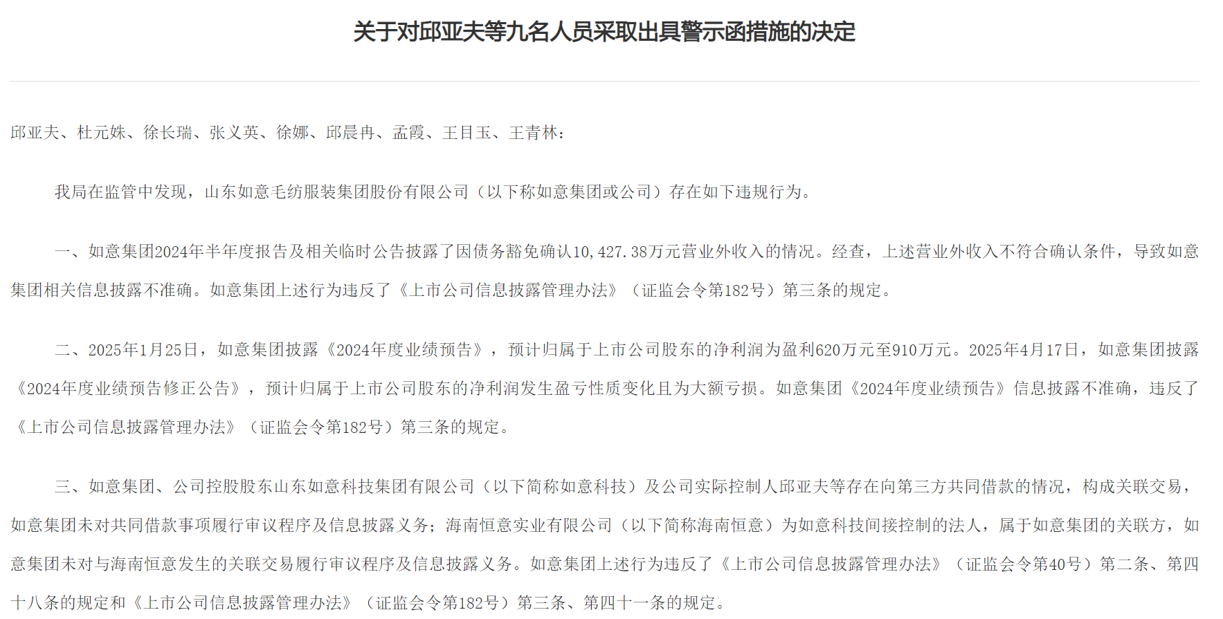 梳理过往公告发现,在2025年4月30日,如意集团及相关当事人收到中国证监会山东监管局出具的行政监管措施决定书。决定书指出公司存在三项违规事实:2024年半年度报告信息披露不准确、《2024年度业绩预告》信息披露不准确,以及关联交易未履行审议程序及信息披露义务。