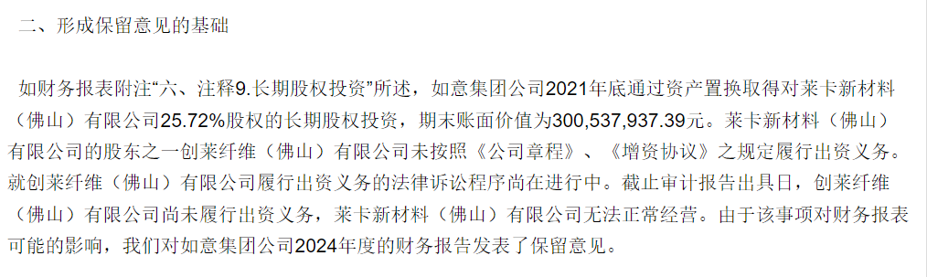 中喜会计师事务所(特殊普通合伙)在2024年年度审计报告中,就一笔价值约3亿元的长期股权投资事项出具了保留意见。该事项涉及公司2021年底通过资产置换取得的对莱卡新材料(佛山)有限公司25.72%的股权,由于对方股东未履行出资义务,导致被投资企业无法正常经营。