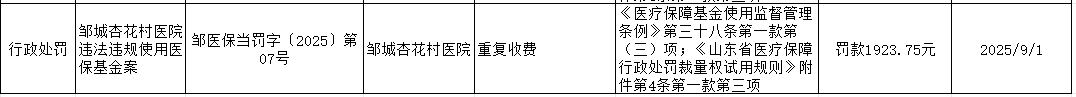 近日,邹城市医疗保障局2025年第一期“双随机、一公开”检查结果信息公示,邹城杏花村医院因重复收费被罚款1923.75元。此案件名称为“邹城杏花村医院违法违规使用医保基金案”,行政执法决定书文号为 邹医保当罚字〔2025〕第07号 。