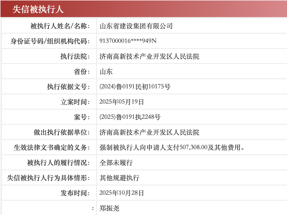10月28日,中国执行信息公开网发布了山东省建设集团有限公司(以下简称“山东省建设集团”)的失信被执行人信息。而在此前一天,该公司及其法定代表人郑振尧被济南高新技术产业开发区人民法院发出限制消费令。