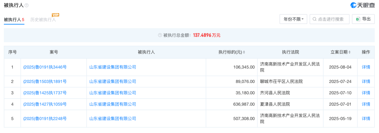 值得注意的是,公开信息显示,今年以来,山东省建设集团新增了5条被执行人记录,被执行总金额137.4896万元。
