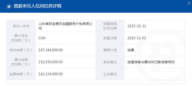 消息显示:截至2025年10月31日,6个月内发生3次以上承兑人逾期的承兑人数量为4606家。山东省财金惠农金融服务外包有限公司在列,该公司累计逾期发生额152,930,000.00元,逾期余额142,324,000.00元,承兑余额147,344,000.00元。