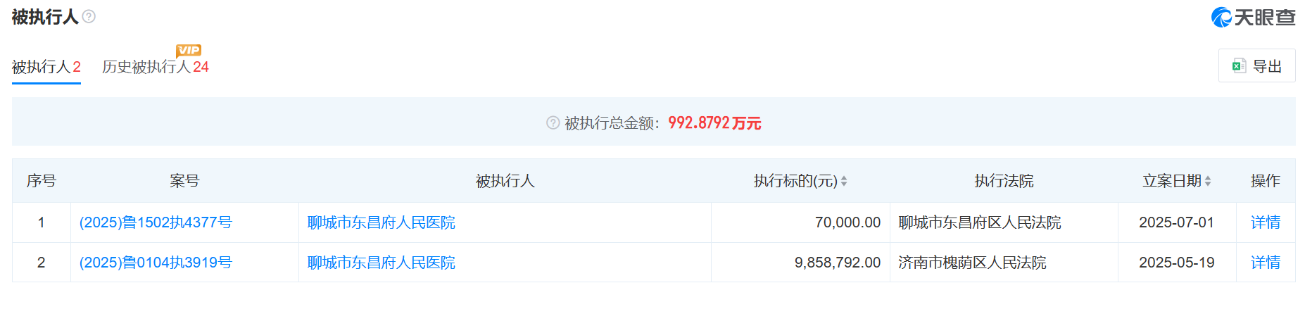 今年以来,聊城市东昌府人民医院新增两条被执行人信息,被执行总金额992.8792万元。