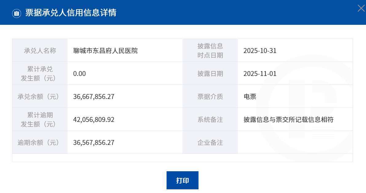 消息显示,2025年5月1日至2025年10月31日,发生3次以上票据逾期,且月末有逾期余额或当月有票据逾期行为发生的承兑人数量为793家,聊城市东昌府人民医院在列。