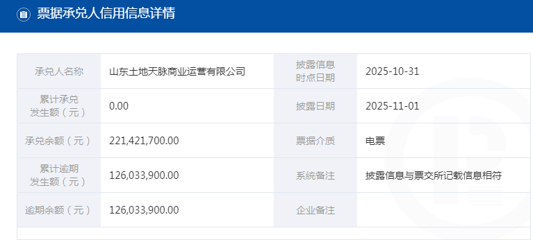 截至11月12日,山东土地天脉商业运营有限公司尚未就上述承兑人逾期等信息作出说明。