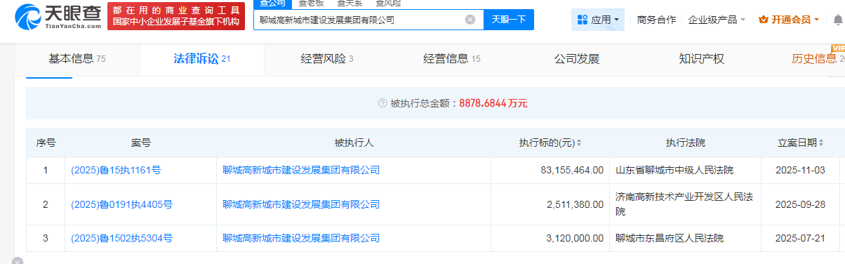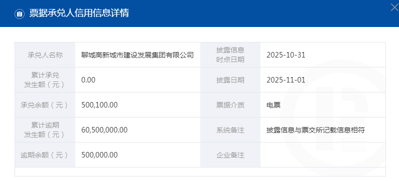 消息显示:截至2025年10月31日,6个月内发生3次以上承兑人逾期的承兑人数量为4606家。聊城高新城市建设发展集团有限公司(下简称“聊城高新城建集团”)在列,该公司累计逾期发生额60500000元,逾期余额500000元,承兑余额500100元。