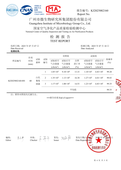 据国家有关空气净化产品质量检测检验中心测试数据显示,负氧离子全屋系统除菌率(白色葡萄球菌)平均值为99.35%。