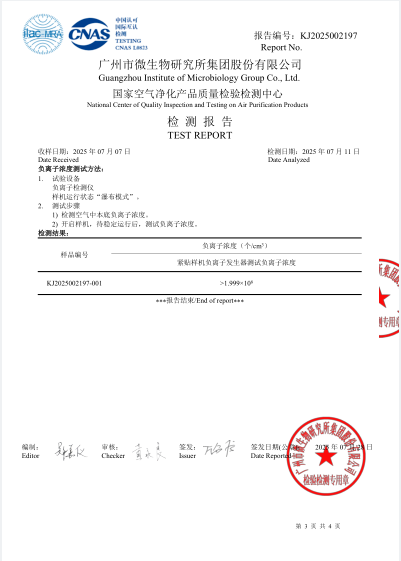 紧贴样机负离子发生器测试负离子浓度,大于1.999亿/cm³。这是国家空气净化产品质量检验检测中心,为成颐堂健康管理有限公司研发生产的负氧离子全屋系统出具的检测数据。
