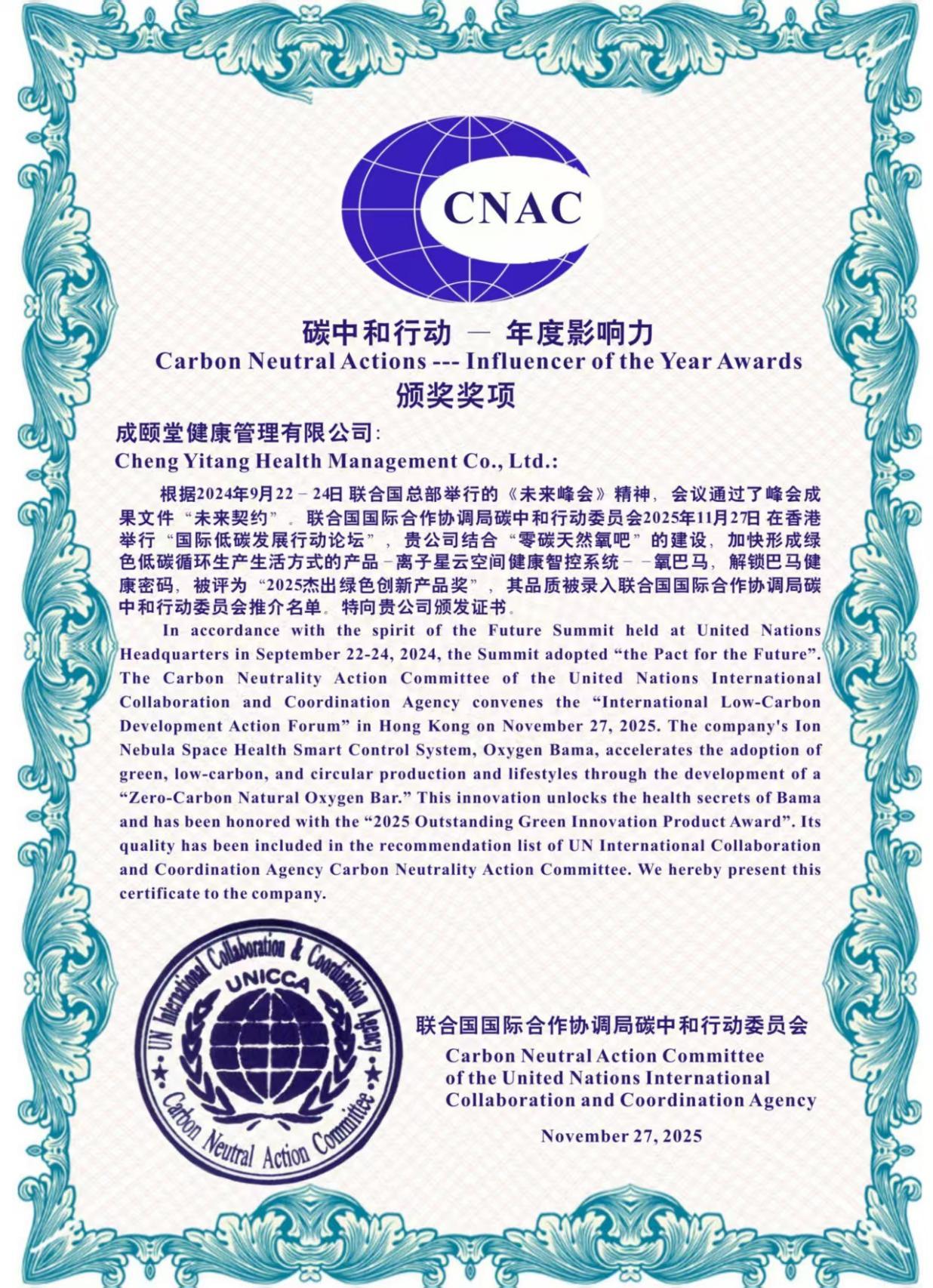 《碳中和行动——年度影响力颁奖奖项》给成颐堂健康管理有限公司的颁奖词写道:“联合国国际合作协调局碳中和行动委员会2025年11月27日在香港举行“国际低碳发展行动论坛”,贵公司结合“零碳天然氧吧”的建设,加快形成绿色低碳循环生产生活方式的产品——离子星云空间健康智控系统——氧巴马,解锁巴马健康密码,被评为‘2025杰出绿色创新产品奖’,其品质被录入联合国国际合作协调局碳中和行动委员会推介名单,特向贵公司颁发证书。”