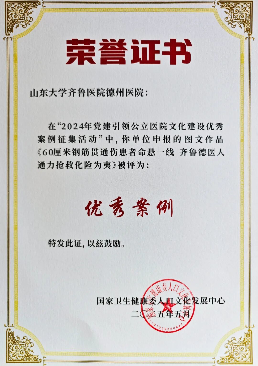 日前,国家卫生健康委人口文化发展中心公布2024年“党建引领公立医院文化建设优秀案例”评选结果,经作品征集、收集整理、专家评审等环节,齐鲁医院德州医院宣传统战科申报的图文类案例《60厘米钢筋贯通伤患者命悬一线 齐鲁德医人通力抢救化险为夷》在609家医院的795个案例中脱颖而出,成功入选。