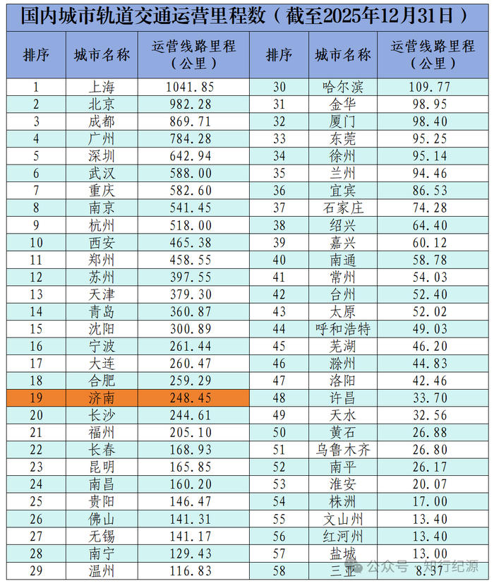 再看一下最新的多制式轨道交通合计统计数据,截止到2025年12月31日,国内城市轨道交通(含地铁、云巴、有轨电车等)开通里程中,济南纳入统计的线路总里程数为248.45公里,排名第19位。