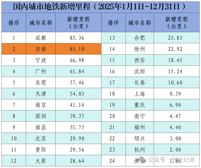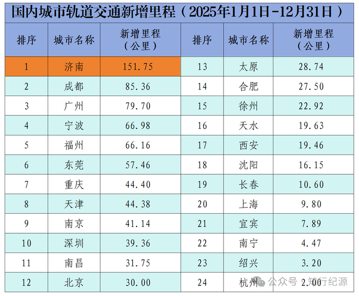 2025年度城市轨道新增里程数,济南全国第一