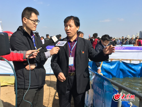 临沂市渔业局生产业务科科长赵西才(右)接受大众网记者采访