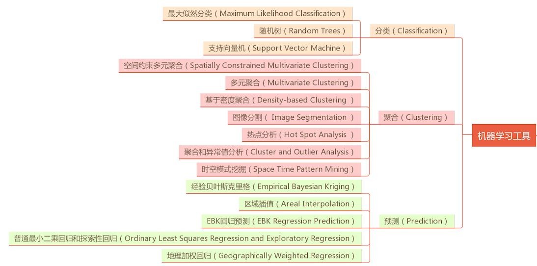 这里不对三大分析框架展开讨论,重点带大家了解地理人工智能GeoAI入门的第一步:机器学习工具。分类、预测、聚合是机器学习中使用最广泛的方法,ArcGIS已经封装好了一系列工具,下面简单介绍主要的三个工具集,学习的软件推荐大家使用ArcGIS Pro,可以方便地调用三大分析框架,并实现分析模式探索,训练样本生成,样本导出到TensorFlow或者CNTK框架构建的模型进行训练,再把优化后的模型导回到ArcGIS Pro,最终实现对空间和表格数据的分析和可视化。