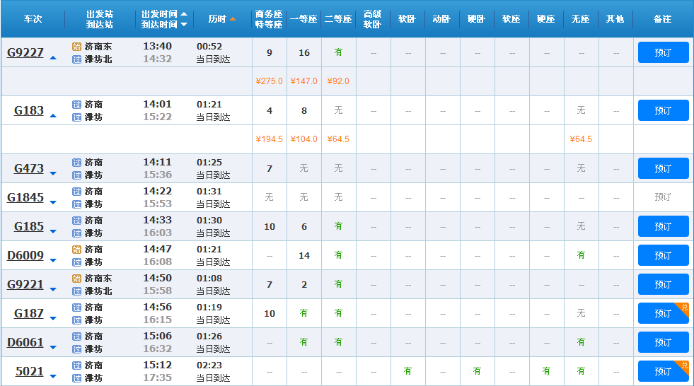 26日下午,记者从12306购票系统上查询发现,目前共有四对列车停靠潍坊高铁北站。G9217次9:08从济南东站始发,9:59到达潍坊北站,10:48到达青岛北站。G9218次9:08从青岛北站始发,9:53到潍坊北站,10:48到济南东站。G9219次11:50从济南东站始发,12:58到达潍坊北站,13:20到达高密北站,13:55到达青岛北站。G9220次11:50从青岛北站始发,12:21到达高密北站,12:43到达潍坊北站,13:55到达济南东站。G9221次14:50从济南东站始发,15:39到达青州市北站,15:58达到潍坊北站,16:55到达青岛北站。G9222次14:50从青岛北站始发,15:43到达潍坊北站,16:02到达青州市北站,16:55到达济南东站。G9227次13:40从济南东站始发,14:32达到潍坊北站,16:25到达岚山西站。G9228次10:35从岚山西始发,12:23到达潍坊北站,13:20到达济南东站。