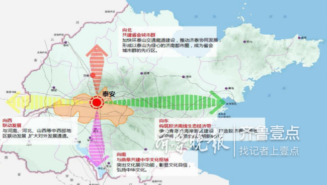 规划还提出了构建泰安增长极,助推全省新旧动能转换。以泰山为核心,加快环泰山交通廊道建设。向北,推动济泰协同发展,共建省会城市群。向东,依托青岛西海岸新区建设,构筑胶济南线生态经济带,拓展新空间,发展新经济。向南,与曲阜共建中华文化枢轴,突出文化展示功能,彰显文化自信,弘扬中华文化。向西,与河南、河北、山西等中西部地区联动发展,扩大对外发展通道。