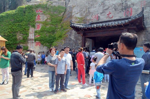 5月1日,淄博博山区源泉镇开元溶洞景区迎来一大批游客前来游玩参观,游客们纷纷在著名岩溶专家赵俊芬题词的“天下第一洞”前合影留念。,,