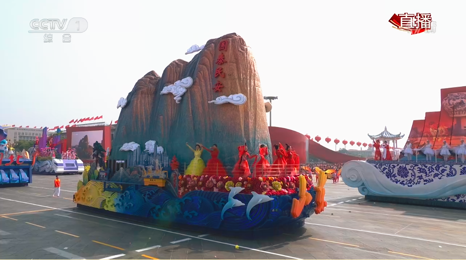 在群众游行环节,以“国泰民安”为主题的山东彩车在天安门前亮相。
