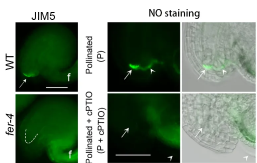 果胶质在野生型胚珠丝状器部位积累,介导花粉管进入胚珠后产生一氧化氮,以阻止诱饵蛋白吸引其他花粉管
