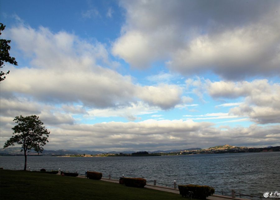 山东泰安迎来蓝天白云晴好天气 青云湖美景如画