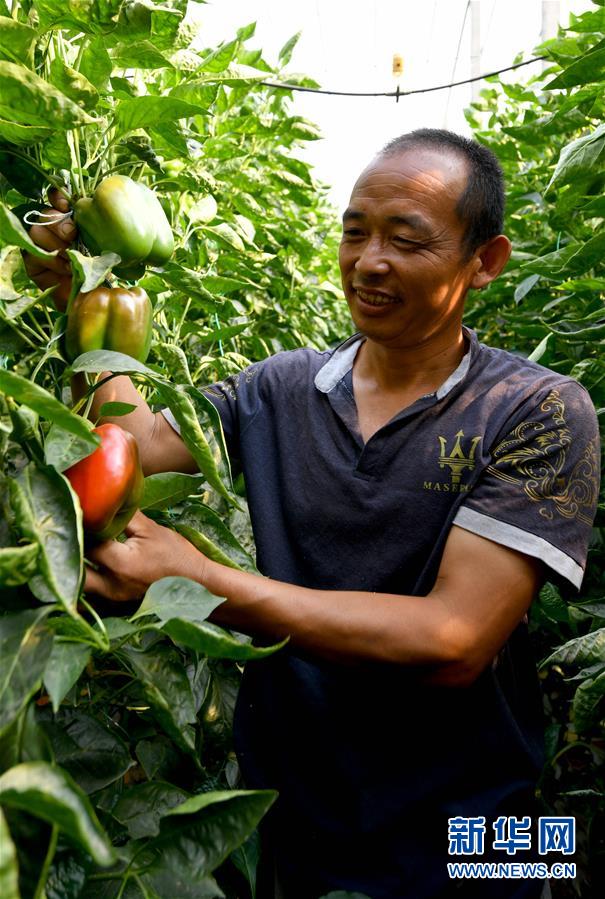 7月7日,崔岭西村村民闫少文在查看自家大棚种植的彩椒。 山东省寿光市是我国重要的蔬菜产地和集散地。2014年,寿光市崔岭西村成立了寿光市众旺果蔬专业合作社,种植高质量西红柿、彩椒、甜瓜等品种。目前,合作社有社员133户,现代化大棚1105亩,每年向俄罗斯莫斯科、伊尔库茨克、叶卡捷琳堡等地出口优质蔬菜15000吨,交易额1亿多元人民币。 新华社记者 朱峥 摄/n/n