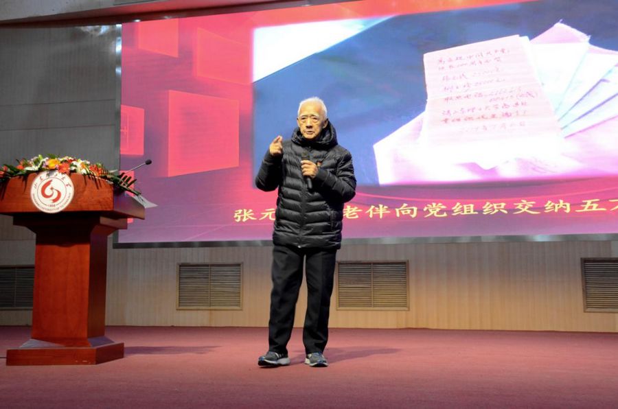 “未忘初心”代表张元成老师用历尽千帆却初心如磐的坚定信念诠释了一名老党员爱党爱国的无限忠诚。张元成勤恳工作一辈子,不求索取,为人豁达;退休后,义务为中小学生讲座20余场,每次离退休人员发放福利,他都脚蹬三轮,为每一位子女不在身边、身体行动不便的老同志挨个送到家中;担任离退处党支部委员、小组长10余年,认真负责,每次收缴党费都主动爬楼入户;今年七一,更是和老伴一次性上交“50000元特殊党费”,每人25000元,寓意长征胜利;汶川地震、资助贫困学生,更是从不落下。讲至情深处,老人家言语哽咽,微微颤抖的声音却发出直抵人心的铮铮誓言,一首自己作词作曲并现场演唱的爱国歌曲更是将报告会推向高潮……