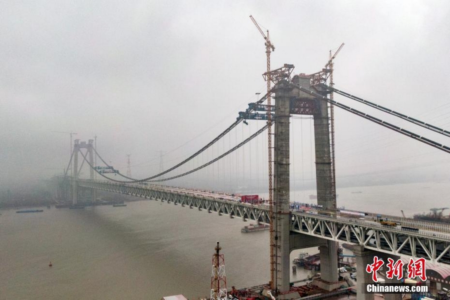 12月26日,随着最后两节钢梁连接处焊接完成,位于江苏镇江的五峰山长江大桥合龙。据了解,五峰山长江大桥全长6409米,主跨1092米,下层为4线高速铁路,上层为双向8车道高速公路,是中国第一座公铁两用悬索桥。中新社记者 泱波 摄