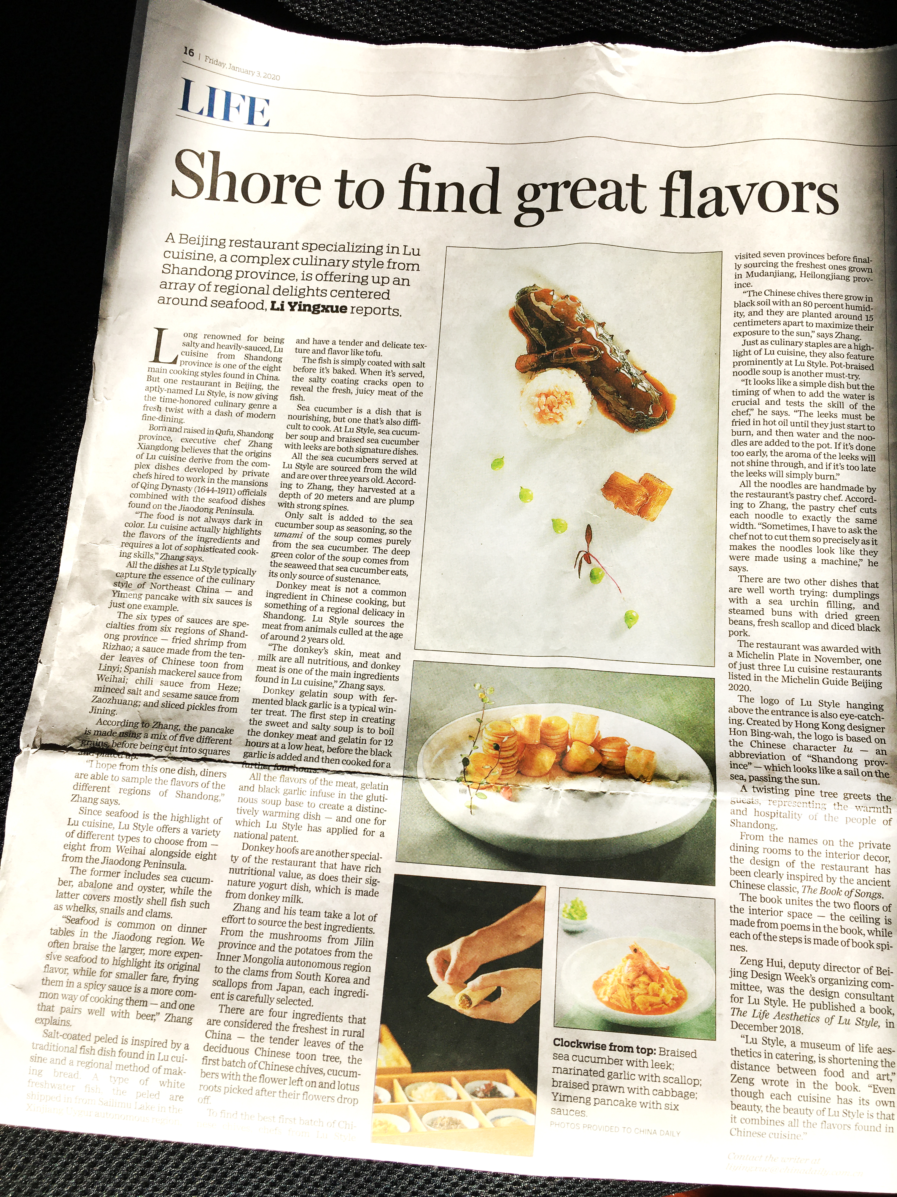“虽然每一道菜都有自己的美,但鲁菜之美在于它融合了中国菜的所有味道……”在1月3日的《中国日报》国际版上,用全英文的整版登出了LU STYLE鲁采的报道——这家鲁菜餐厅在大众点评App上被打出各项4.9分以上的高分,五项排名都在济南第一(截至发稿前)不仅荣获《米其林指南》餐盘奖,还荣登有“中国米其林”之称的《黑珍珠2020榜单》,目前仍是国内唯一一家同揽这两项荣誉的鲁菜餐厅;它在家乡土地扎根前,先在北京城和上海滩闯出名气,是鲁菜在高端餐饮领域“破冰”的典型代表,也是鲁菜文化走向国际化的一个样板。
