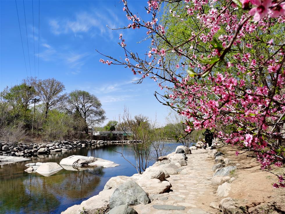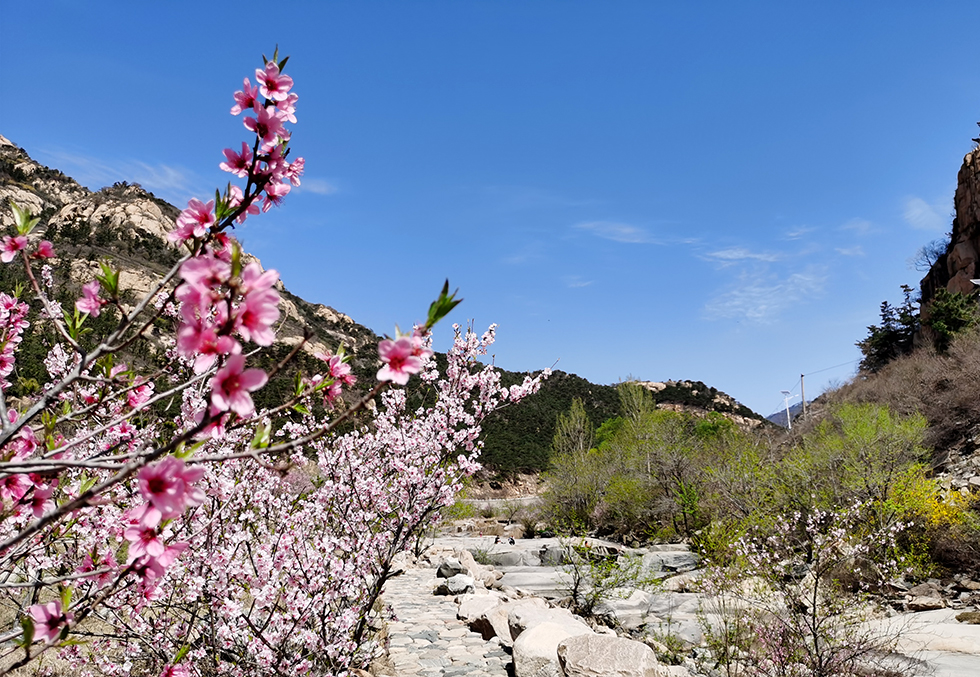 山间流水潺潺,清澈透底,可以洗目濯心。“春来遍是桃花水,不辨仙源何处寻?”一株株粉色桃花在春水的映衬下,更是风流婉转,婀娜多姿。沿着溪水溯流而上,粼粼波光随着清甜的风微微晃动,远看如碧玉,如绿带,带着叮咚叮咚的响声,敲击着20多亿年的岩石,这是春的音符,是山的欢声。