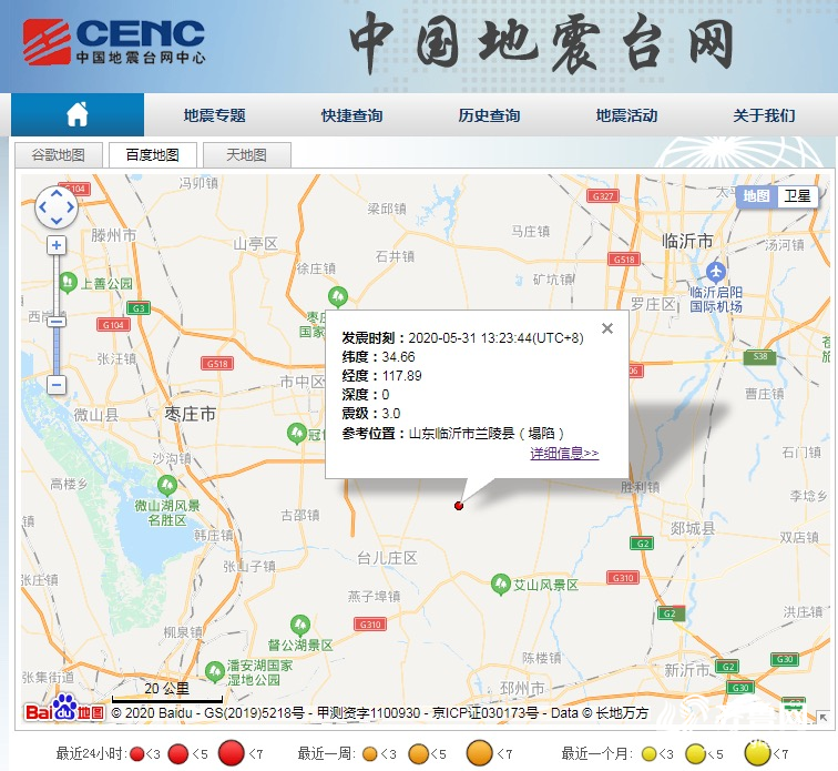 齐鲁网·闪电新闻5月31日讯 31日13时23分,中国地震台网正式测定山东临沂市兰陵县(塌陷)(北纬34.66度,东经117.89度)发生3.0级地震。