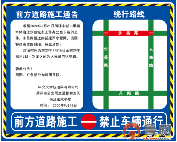 鲁网9月15日讯(记者 范祥海)15日,鲁网记者获悉,根据2020年5月21日菏泽市城市黑臭水体治理示范城市工作办公室下达的文件,永昌路段道路新建雨水管网,现需将该段道路封闭,封闭时间为2020年9月16日至2020年10月6日;封闭区间为人民路与华英路。