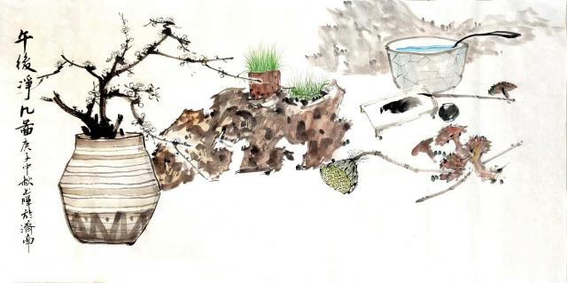 只见他时而大刀阔斧地画着曲折的粗线条,时而细致地勾画、轻点几下,不一会儿,便见纸上几支盛开的梅花已经静静插在陶罐里了。曲折的梅花枝和素淡的白梅,伴着古朴的陶罐,更凸显画作的古拙之气,清新淡雅,别有一番风味。换笔调色,再落笔,或柔顺勾画,或含力顿挫,陶罐斜后方又添一奇石,石上再细细作两丛龙须菖蒲,鲜嫩的绿色给画作添了一丝生机。随后在画作左边作瓷盆、砚台,其下添莲蓬、灵芝,整幅画作便更丰满、更有生气了。