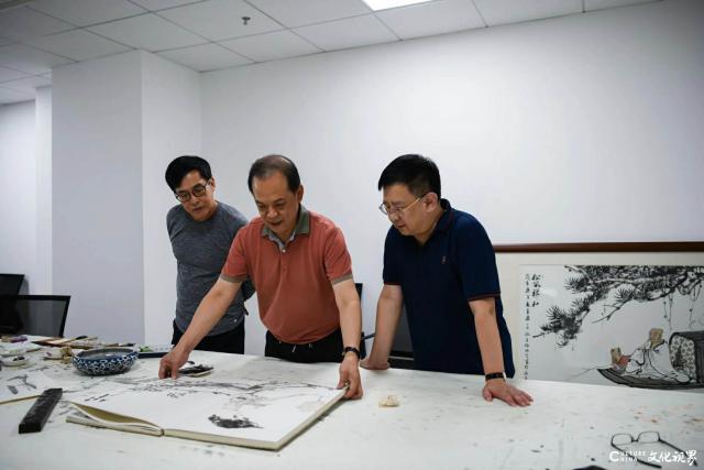 说话间画作收尾完成,众人一同喝茶歇息。谈笑中焦书晖先生给大家展示了他的扇子以及所藏古砚的册集。画砚、藏砚以及谈起古砚时挑起的眉毛和大大扬起的嘴角都表现着焦书晖先生对古砚的喜爱。梁洪文董事长也取出珍藏的诸位书画大家赠予文化视界网的书画作品与册页,大家一同欣赏品鉴。