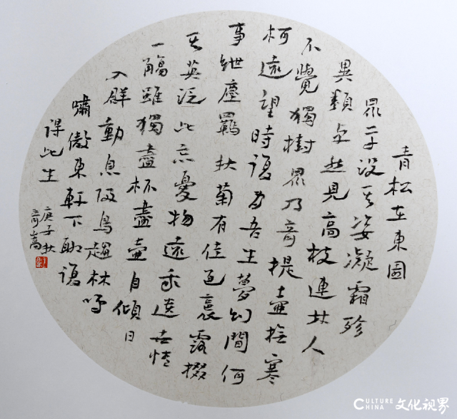 浏览过后,大家来到书画氛围浓厚的云间画室,为文化视界网再添新作。王奇嵩先生先分别在扇形和圆形卡纸上以端正小楷落笔五柳先生陶潜的《饮酒·青竹在东园》和《移居二首》其二,又在册页上写下篇幅更长的《五柳先生传》,王奇嵩先生对陶渊明的喜爱由此可见一斑。铺开宣纸,王奇嵩又以济南为主题,分别以行书和隶书写下赵孟頫的《趵突泉》和杜甫名句“海右此亭古,济南名士多”,最后以草书《终南别业》尽兴收尾。王奇嵩先生爱好分明,诸体皆擅长,书法作品的风格完全自心底流出,不温不火,不急不躁,悠游自在。其书正草无一不佳,篆书渊厚,隶书朴拙,行书萧散,草书放达。当真是气质高华,一如岩穴高士,偃卧松下,坦然自在。