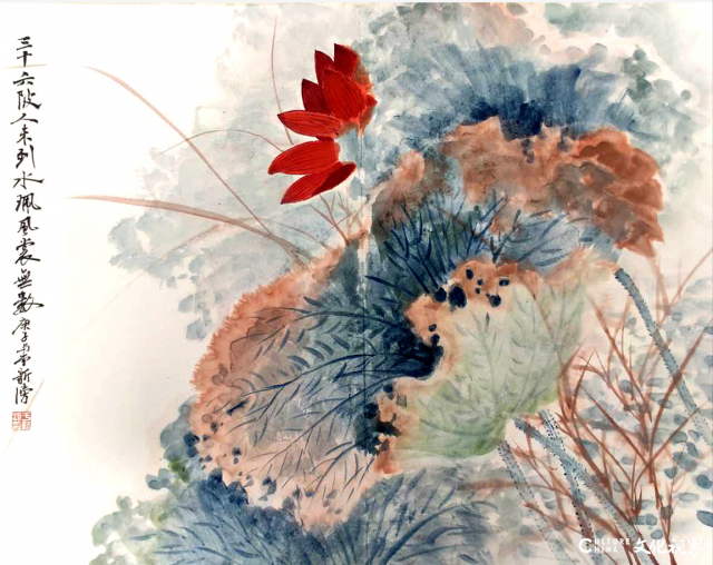再看于新澎先生,一幅《岁寒三友》将喜好和特长一并展现在宣纸之上。于新澎先作奇石,瑰玮秀丽、独特天成的石头落座下方,美观大方却又不占太多尺幅,原来是为古松留出了伸展成型的空间,松树苍劲坚韧、石中求生,年数甚高却丝毫未有衰败凋落之势。枝干上伴生的藤萝仿佛诉说着它沧桑的年岁,也为它增添着生生不息的活力。茂密的新竹从古松旁冒出,呼应着不断衍生的新生机;梅花从两侧生出,让整幅画色彩和层次感一并达到更完美的高度。画毕,于新澎先生又在册页上创作以“三十六陂人未到,水佩风裳无数”为主题的荷花作品,展现了他在花鸟画方面同样不浅的造诣。