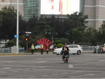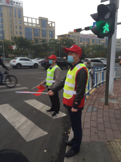 早上7:15,志愿者们早早在路口集合,他们头戴小红帽、身穿反光背心,手拿小红旗,每两人一组分别站在该交叉路口四个方向处,为过往行人作指引,引导市民自觉遵守交通规则,保证来往行人安全过马路。在执勤活动中,志愿者们随时纠正不文明交通行为,耐心提示过往车辆驾驶员减速避让行人,并为主动避让行人的司机“点赞”,志愿者们用规范的动作,文明的语言,赢得了执勤交警的充分肯定。