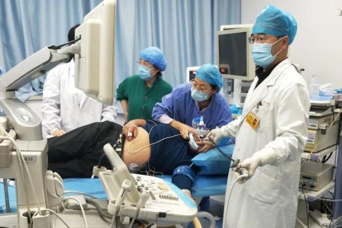 主任医师付世文在主任医师仪福霞的配合下为患者实施经食道实时三维超声心动图无痛检查