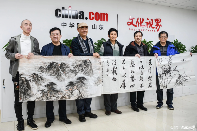 中华网山东&文化视界网董事长梁洪文热情接待了来访贵宾。初冬严寒不掩相聚之欢,大家落座中华网山东&文化视界网办公室,嘘寒问暖之际开始了本次参访。两位书画家讲述人生履历、分享书画见解,展开对不同题材、不同风格的画作的讨论;梁洪文董事长以茶待客,与大家共忆往事、向大家推荐内涵丰富的艺术演出,大家在谈笑声中感受文化视界浓厚的文艺气息。