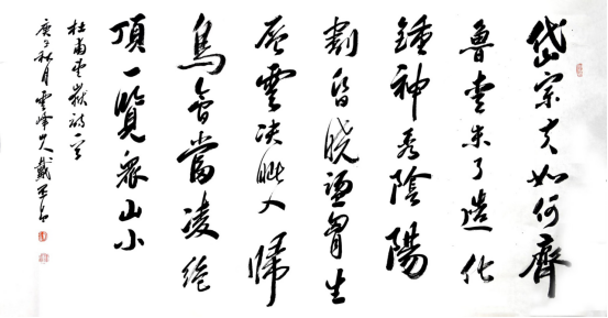 再看戴丕昌,仿佛与赵德勋心有灵犀一般,在宣纸上以行草疾书一首杜甫的《望岳》,与《雄峙天东》若合一契。其书朴雅、凝重之中极具灵动之感,洒脱、豪放之中不乏庄重之姿。