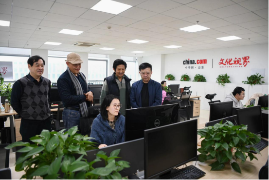 攀谈过后,众人来到中华网山东&文化视界网编辑部,一睹文化视界的前端和幕后。工作人员向大家展示了中华网山东和文化视界网中收录的两位书画家的作品和赏析。两位书画家也不吝发言,把各自最喜欢的、最用心的、最有趣的画作一一向大家介绍,阐述其中深意和背后来历。