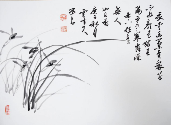 随即二人打开文化视界的册页分别留画,戴丕昌尤擅花鸟,便在册页上绘出一簇清新淡雅的兰花。无需浓妆艳抹、粉饰雕琢,“任是无人也自香”的气息也能透过纸墨,沁人心脾。右侧一首薛网的《兰花》,字里行间的排列和左侧的兰花相映成趣,共同构成一幅书画双全的精美画作。