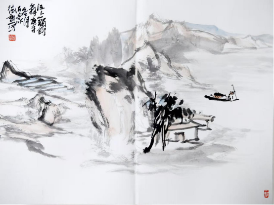 赵德勋更喜欢寄情山水,便在册页上画了一幅《江上独钓》。广袤的山野、宽阔的江面一望无际,简陋的扁舟、静谧的人居渺小孤寂。画作在意境上与“独钓寒江雪”有异曲同工之妙,又在表达方式上有着独特的韵味。